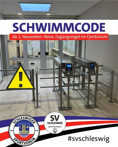 Der Zugang zum Fjordarium ist ab diesem Datum nur noch über einen persönlichen QR-Code möglich. Die erforderlichen QR-Codes werden in den kommenden Tagen generiert und per E-Mail an alle Kursteilnehmerinnen und Kursteilnehmer bzw. Mitglieder des SV Schleswig versendet. Dieser Code ist einmal täglich während der Schwimmzeiten des Vereins nutzbar und gilt ausschließlich für die registrierte Person.